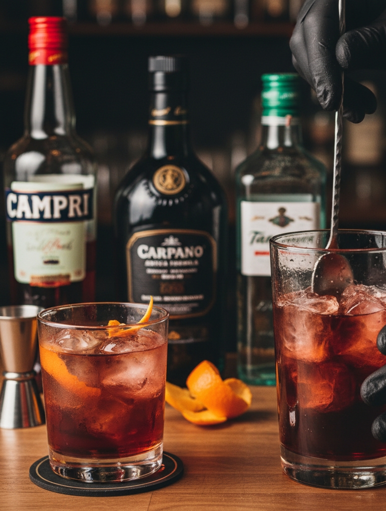 レシピの基本構成は、Gin、Campari、そして Sweet Vermouth を等量づつ