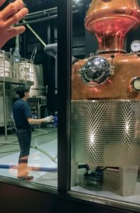 スチルマンがバルブを調節。かっこいい! こう見ると対比で蒸留器がどのくらいの大きさかわかりますね。